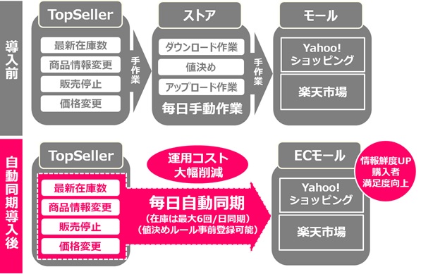 商品データ自動同期システムでは、最新在庫数、商品情報の変更、販売停止、価格変更の各項目の中から自分が同期したい項目だけを選択し、ストアの経営方針や好みに合わせてカスタマイズすることができます。(在庫は最大1日6回、その他は1日1回更新)TopSellerを利用するストアは、これまで毎日1時間掛かっていた運営コストを削減することができると共に、最新の情報を表示することで、購入者の満足度向上を図ることができます。7月7日にYahoo!ショッピング版をリリース後、8月中旬~に楽天市場版をリリース予定です。