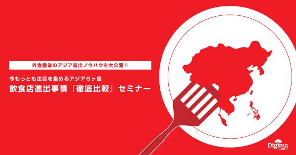 株式会社Resorzが運営する、海外ビジネス支援に特化したプラットフォーム「Digima~出島~(http://www.digima-japan.com/)」は、今もっとも注目を集めるアジア6ヶ国の飲食店進出事情に関する徹底比較セミナーを開催いたします。各回3ヶ国、2回に分けての開催を予定しており、第一弾は7/30(木)に、タイ・シンガポール・台湾編(第二弾は8月27日に中国・インドネシア・フィリピンを予定)を開催いたしますのでお知らせいたします。