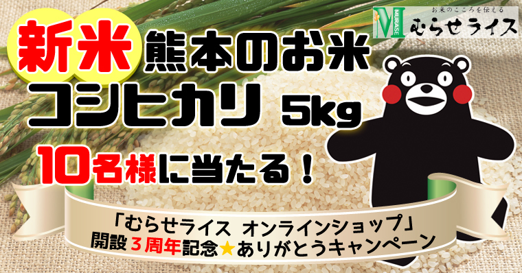 米穀の製造加工および販売を手掛ける、株式会社むらせ(所在地:〒238-0011神奈川県横須賀市米が浜通1-6、代表取締役:村瀬 慶太郎)は、2015年7月6日(月)10:30から、『むらせライスオンラインショップ』開設3周年記念で日頃のご愛顧に感謝を込めて、「27年産新米 熊本のお米コシヒカリ 5kgが10名様に当たる!」むらせライスモニプラキャンペーンを開始しました。