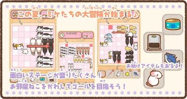 本ゲームでは、ねこずらしで採用した「スライドブロックパズル」をさらに発展させ、200以上のステージマップを用意し、お助けアイテムやお邪魔ねこなど攻略性が増しました。
