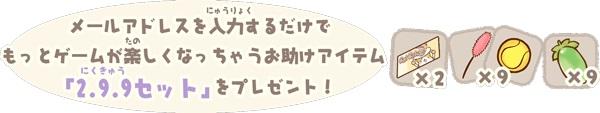 「ねこずらし~にゃんだふる~」に事前登録された方全員に、ゲームリリース時、ゲームクリアに役立つお役立ちセット「299(肉球)セット」をプレゼントします。