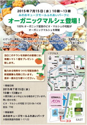 当日は、魅力ある特典を付けたビオ・マルシェの新規宅配会員募集も行うとともに、有機野菜情報を提供し、食に関するオーガニックライフのご提案、ご質問およびご相談を承ります。
