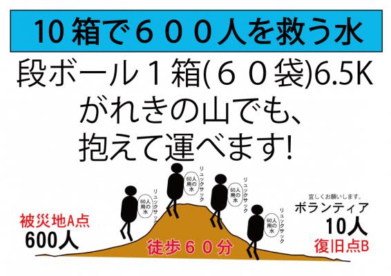 特徴は■ポケットサイズで素早く配布できます!■易開封で寝ていても飲む事が出来、飲み口を曲げるとこぼれにくく押したら出る構造で水道水を煮沸して気密容器のエコデパックに入れ密封後加熱加圧殺菌をしました。■防災コンテナ販売中!