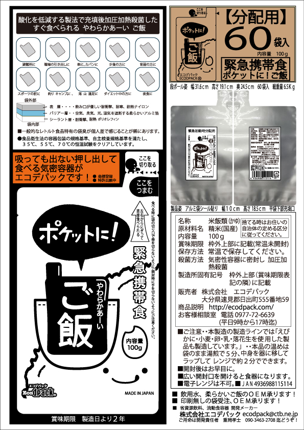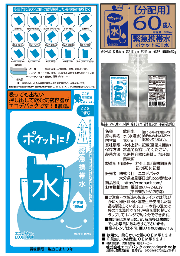 株式会社エコデパック(本社:大分県速見郡日出町(代表)重岡孝士)は2015年8月上旬に、いつでも、どこでも緊急携帯水「ポケットに水」賞味期限3年 と 緊急携帯食「ポケットにご飯」賞味期限2年の発売を開始します!