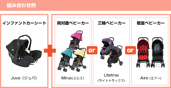 セット販売の『Aire Travel System Juva』(エアー トラベルシステム ジュバ)の他にも、Joieではインファントカーシートとお好みのベビーカーを組み合わせる「トラベルシステム」もご用意しております。