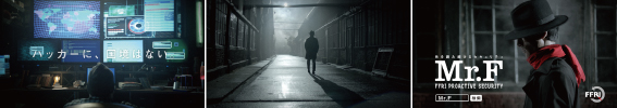 ハッカーと謎の男“Mr.F”の対決を海外映画の予告編風に展開します。既存のセキュリティ対策では検知・防御が困難な、未知の脅威に対抗すべく開発された、新しい解決策としての「FFRI プロアクティブ セキュリティ」を、謎の男“Mr.F”の活躍と重ねて描きました。