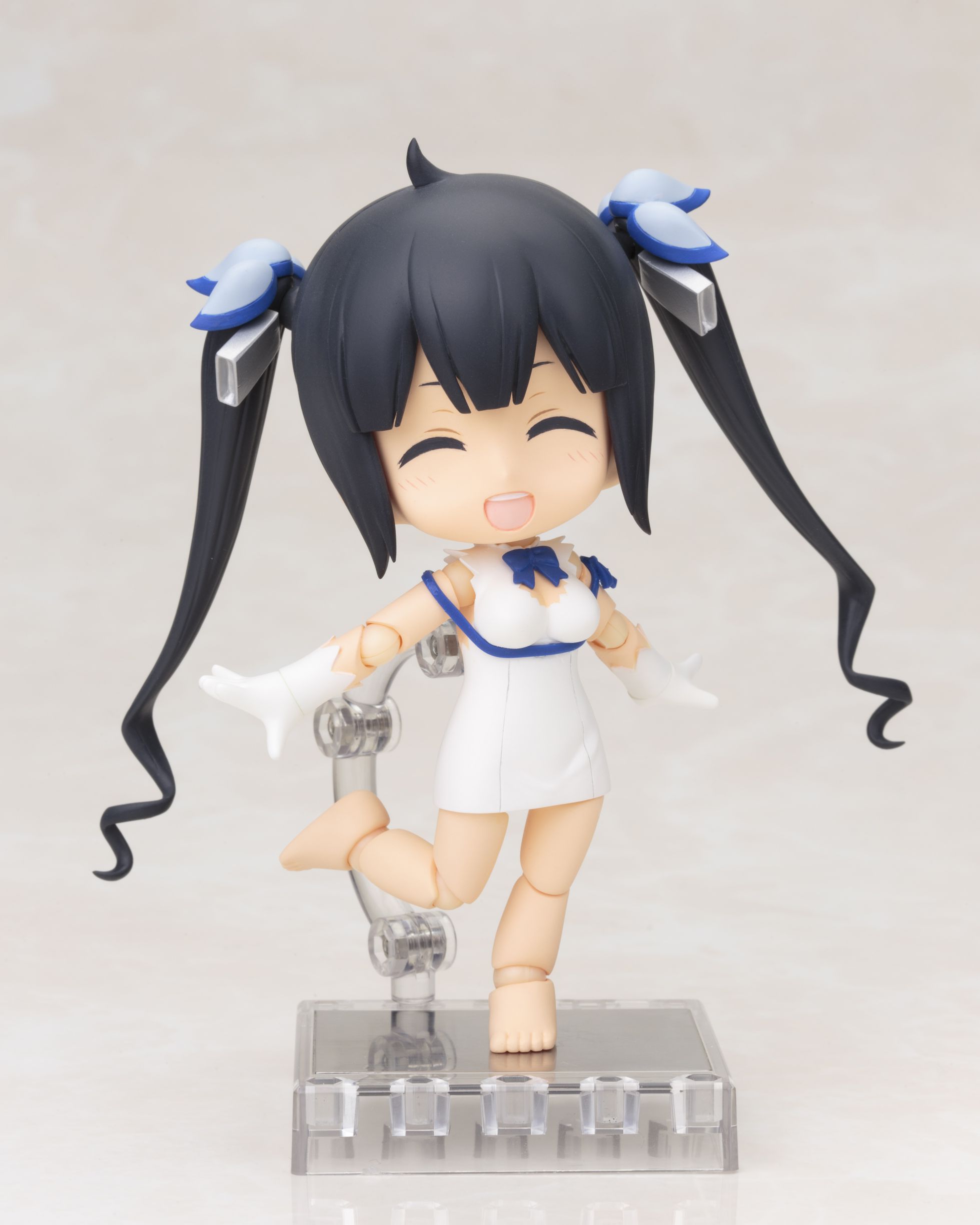 うごいてたのしいポケットさいずのキュートなふぃぎゅあ「キューポッシュ」。シリーズ第24弾は、『ダンジョンに出会いを求めるのは間違っているだろうか』より、主人公であるベル・クラネルの所属する[ファミリア]の主神、ヘスティアが登場です。「キューポッシュ」とは、2.3頭身のデフォルメキャラクターたちの、とっても可愛いポケットサイズの新しい可動フィギュアシリーズです。小さな体に豊富な可動、足裏のマグネットにより専用ベースの上では楽々といろんなポーズがとれ、充実の付属品でキャラクターのいろんな表情や印象的なシーンを再現できます。ヘスティアの胸まわりのブルーのリボンは、腕の動きを邪魔しない少し柔らかめの素材となっています。付属の4種の表情パーツで、表情がころころ変わるカワイイ神様の魅力をお楽しみください。