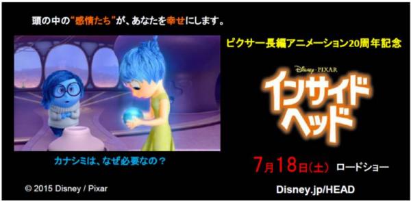「インサイド・ヘッド」(7月18日(土)公開)は、ピクサー長編アニメーション20周年記念作品であり、誰もが持っているのに誰も見たことがない、無限に広がる頭の中の世界で “感情たち”が繰り広げる感動の冒険ファンタジーです。
