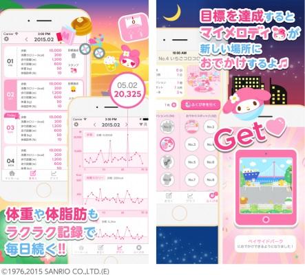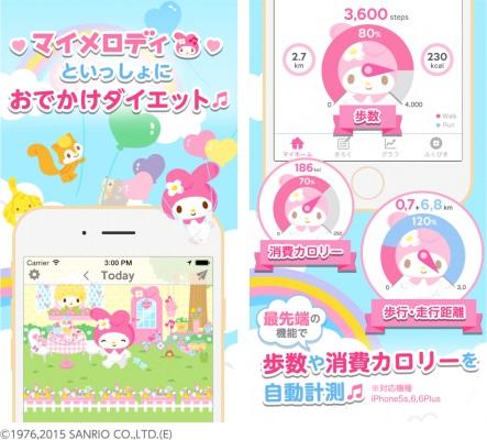 ダイエットアプリ「おでかけマイメロディ」は、iPhoneを持って移動した歩数を自動で算出し、そこから消費カロリーを自動で計測してくれるダイエットアプリです。身長・体重等のパーソナルデータを入力することで、1ヶ月で1Kg痩せるために必要な歩数を算出、マイメロディと一緒に達成率を毎日楽しく確認することができます。