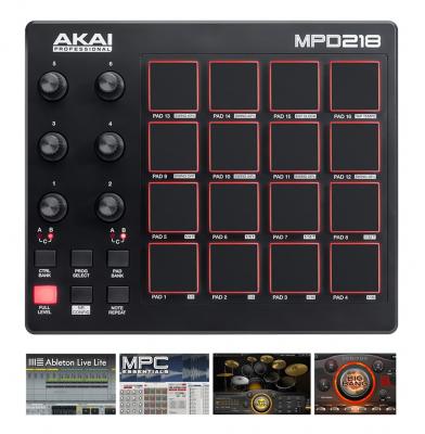 MPD218は、前モデルより6つのノブと3バンク機能が新たに搭載され、パッドはバックライト付のMPCモデルのパッドコントローラです。また、ノートリピート、フルレベル機能も搭載し、USBバスパワー駆動しACアダプタは不要です。