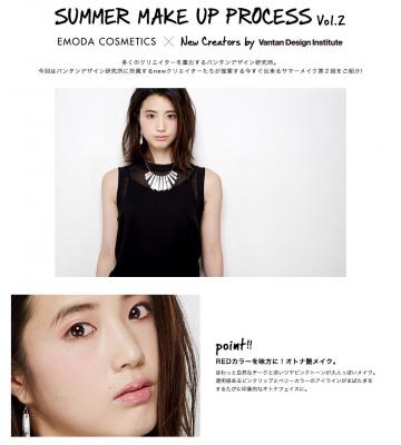 ファッション、ヘアメイク、ビューティ、グラフィックデザイン、映画映像、フォト、ゲーム、アニメ、マンガ、パティシエ、カフェ、フードコーディネーターなどのクリエイティブ分野に特化し、即戦力人材を育成するスクール運営事業を行っているVantan(バンタン)(本部所在地:東京都渋谷区 代表取締役専務:石川広己) は、バンタンデザイン研究所とEMODA COSMETICS(エモダ コスメティクス)とのコラボレーションにより、EMODA COSMETICSのコスメアイテムを使用した2015年夏向けのサマーメイクを企画提案し、EMODA COSMETICS公式ECサイトで公開するプロジェクトを実施致しました。