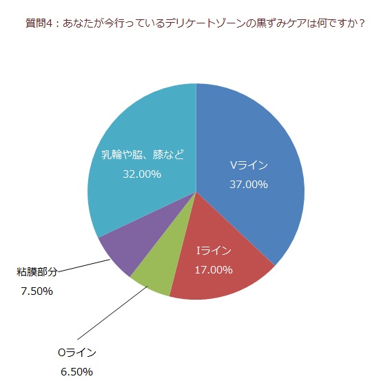 どの部分の黒ずみが一番気になるかとう言う質問に対して、一番多かったのがVラインの37%でした。また、最近では気にしてる方も多く、ケアアイテムも多くなってきている部分で言えば、意外にも乳輪、わき、膝も黒ずみの悩みを抱えている方が多い結果になりました。
