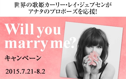 結婚式場の日本最大級のクチコミサイトを運営する株式会社ウエディングパーク(本社:東京都港区、代表取締役社長:日紫喜 誠吾 以下ウエディングパーク)は、式場探しの決め手が見つかるクチコミサイト「ウエディングパーク」にて、ユニバーサル ミュージック合同会社に所属する女性アーティスト「カーリー・レイ・ジェプセン」との共同企画、『「Will you marry me?」キャンペーン』を7月21日(火)に開始いたしました。