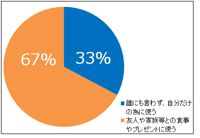 同サイト会員女性を対象に、「ちょっとした臨時収入を手に入れたときにどう使うか」について聞いたところ、「友人や家族等との食事やプレゼントに使う」と回答した人が67.0%、「誰にも言わず、自分だけのために使う」と回答した人が33.0%という結果となりました。