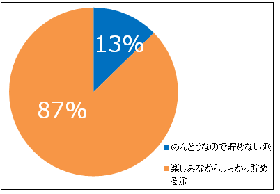 さらに「日常様々なお店やサービスでもらえるスタンプやポイント」について聞いたところ「楽しみながらしっかり貯める派」と回答した人が87.0%、「めんどうなので貯めない派」と回答した人が13.0%という結果となりました。