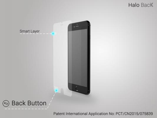 Halo BackはそんなiPhoneの操作性を解決するために生まれたiPhone専用の液晶保護強化ガラスシートです。ホームボタンの左側ベゼル部分に、画面左上、アプリで「戻る」ボタンが表示される場所とつながる透明の電極を内蔵しており、そこを軽く触るだけで「戻る」ボタンの役割をスマートに持たせることができるようになります。