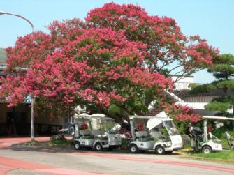 「益子カントリー倶楽部」(TEL:0285-72-1234)は、昭和50年(1975年)開場の歴史あるコースで、緩やかな丘陵地にレイアウトされた27ホール。全体に高低差の少ないフラットな地形に恵まれていますが、各ホールがそれぞれ個性を発揮し、その変化に富んだホール構成はプレーヤーを飽きさせません。また、各9ホールのコース名称になっている「やしお」「さぎそう」「さくら」からもうかがえるように、敷地内には四季折々の花々や樹林の緑など豊かな自然がひかえ、とくにこのシーズンに咲き誇るクラブハウス前コース側の「百日紅(サルスベリ)」の開花はみごとで、同ゴルフ場のシンボルツリーにもなっています(写真参照)。ロッジタイプの宿泊施設も用意されていますので、泊まりがけのリゾートゴルフとしても最適です。