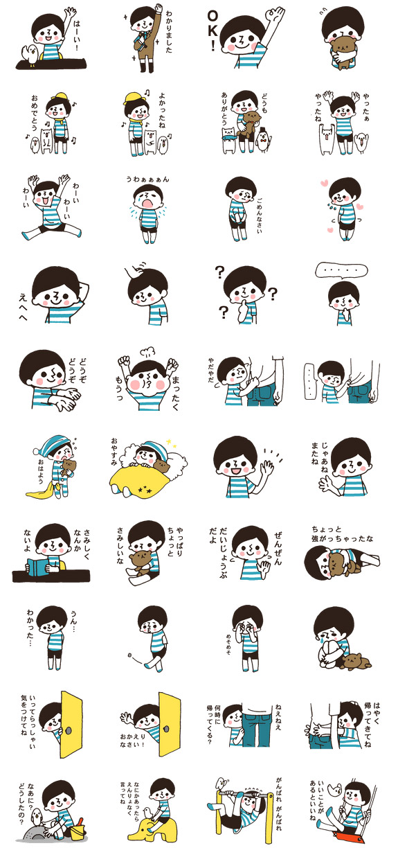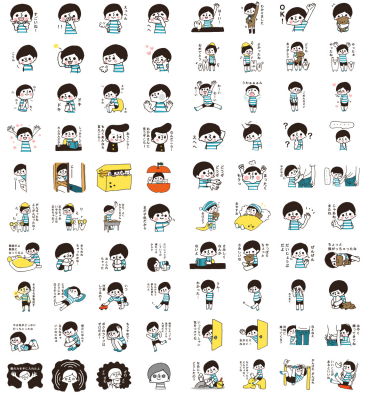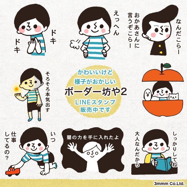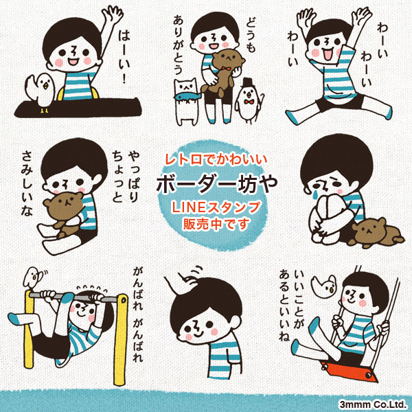 ボーダーシャツを着たレトロ風な少年のスタンプ「ボーダー坊や」が第1弾、第2弾同時リリースです。