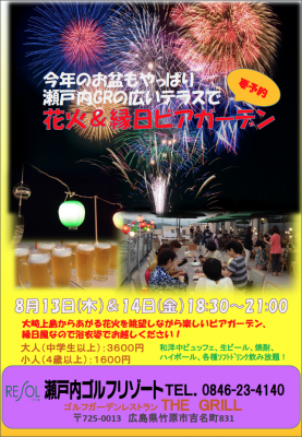 ゴルフ場やホテル、大規模リゾートなどの運営&運営支援を通して、リゾートの再生と活性化を推進するリゾートソリューショングループ(略称:リソルグループ、本社・東京新宿区、多賀道正社長)が全国に運営するゴルフ場のひとつ、「瀬戸内ゴルフリゾート」(広島県)では、瀬戸内海を一望する展望レストラン「ザ・グリル」において、夏休み真っ盛りのお盆時期、瀬戸内の島からあがる盛大な花火を眺めながらの「花火&縁日ビアガーデン」を開催いたします。