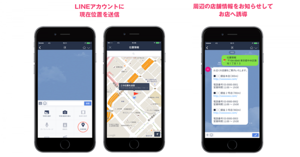 LINEアカウントに位置情報をメッセージ送信すると、最寄りの店舗情報が返信されます。位置情報以外にも駅名や住所による絞り込みトークが可能です。