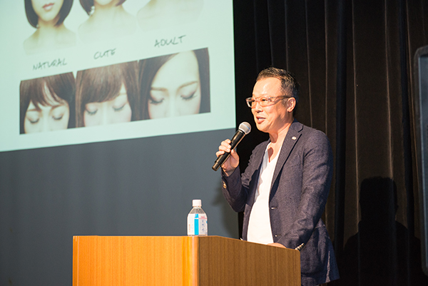 JMA理事長 村野和雄の開演の挨拶のあと、「メイクスタイリスト育成プロジェクト」のプロジェクトリーダー 越智岳也氏より、本プロジェクトの説明が行われました。越智氏は、いまどきの女性はヘアスタイルよりも「目元とバング」を変えることで「なりたいイメージ」に近づこうとすると話したうえで、「ヘアー・アイラッシュ・メイク」の個々のパーツをトータルでプロデュースできる人材が必須だと強調。メイクスタイリストは今後の美容業界を牽引する人材であり、お客様が求める人材であると語りました。スクリーンでは、実際にメイクスタイリストとして活躍する女性のインタビュー映像など具体的な事例を見せながら、新規顧客増加、売上アップ、スタッフのモチベーション保持や離職率低下など、メイクスタイリスト導入後のサロンへのメリットを紹介しました。