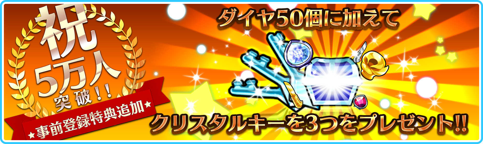 事前登録者数が5万人を突破したことを記念し、クリスタルキー3つを追加でプレゼントいたします。