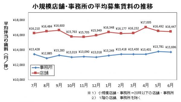 小規模店舗(20坪以下)の平均募集賃料は、前月から0.3%下降しましたが、前月並みの坪当たり1.6万円台半ばに落ち着きました。