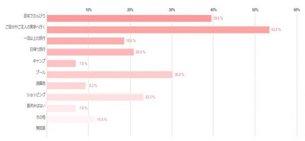 最も多かったのが、「ご自分やご主人の実家に行く」で53.5%でした。お墓参りなど兼ねて、ご実家に行く方が多いようです。