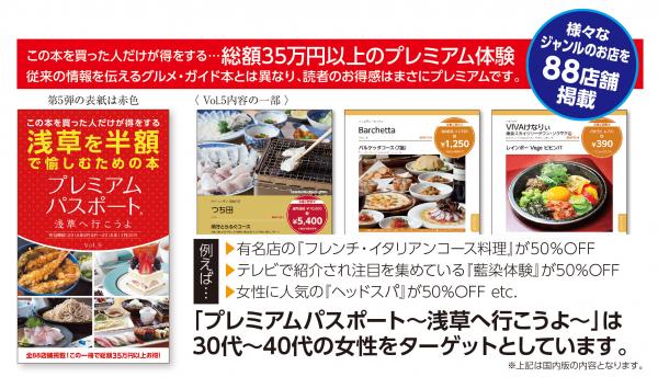 浅草・東京スカイツリーエリアにおいて、創業38年の株式会社宣昭(所在地:東京都足立区、代表取締役社長:三浦 久留美)は、地域企業と消費者が繋がる出版物「プレミアムパスポート~浅草へ行こうよ~Vol.5」を2015年8月8日に発売します。また、今回は訪日 外国人からのリクエストに応えて、台湾(翻訳版)での同時発売を予定しております。