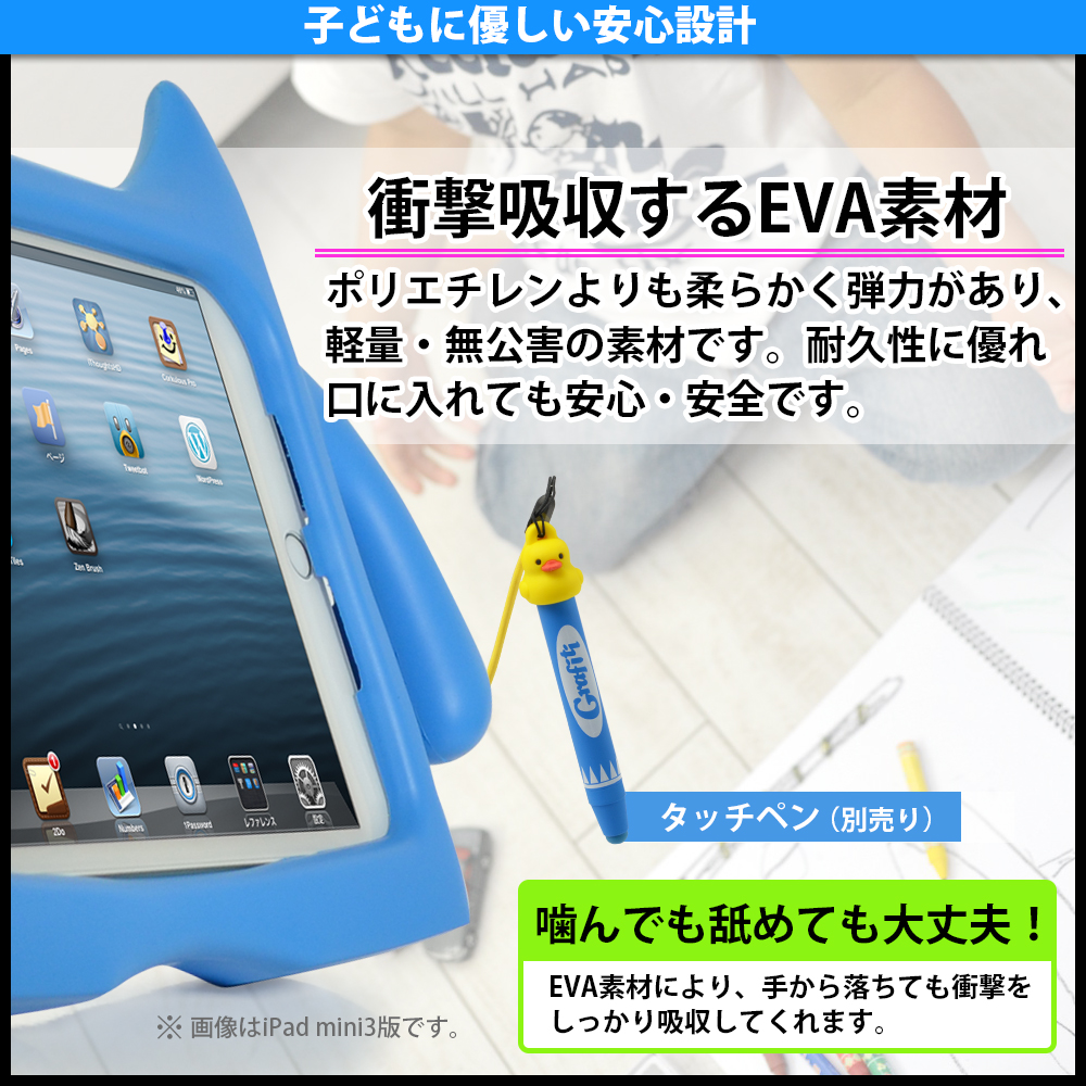 ケースに使用されている素材はEVA素材で、人体に影響を及ぼす環境ホルモンを含まない安心素材です。お子様が噛んだり、舐めたりしても安心な素材です。また、劣化しにくく耐久性もありますので、手洗いすることもできますので、いつも清潔に使用することが出来ます。