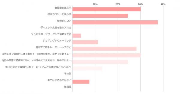 食事のジャンルでは、「間食をしない」が最も多く、37.7%。「ダイエット食品を取り入れる」というママさんは意外にも0%でした。