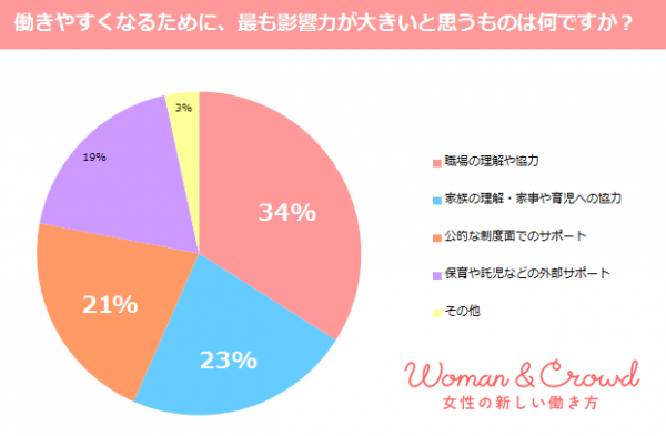 家族や外部からのサポート以上に、働く職場の理解が重要だと回答した既婚女性が3割を超える結果になりました。「子どもが小さいという理由で面接を落とされた」という経験談や、「家庭の事情で止むを得ず欠勤や早退をする際に、周りから嫌味を言われてしまうと、長く働くことは難しいと感じる」といった回答から、職場環境に対する女性たちの率直な不安や懸念が見える結果となりました。