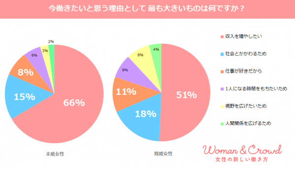 未婚女性と既婚女性の双方で、過半数を占め最も多い回答は「収入を増やしたい」というものでした。