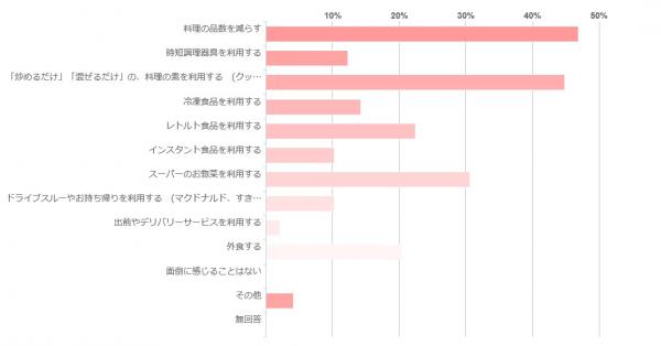 最も多かったのが「料理の品数を減らす」46.9%、次が「炒めるだけ、混ぜるだけ、の料理の素を利用する」44.9%でした。