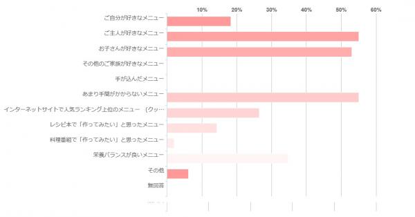 「ご自分の好きなメニュー」を重視する方は意外と少なく18.4%。「ご主人の好きなメニュー」55.1%、「お子さんが好きなメニュー」53.1%で、家族の好みを優先させて決めているようでした。