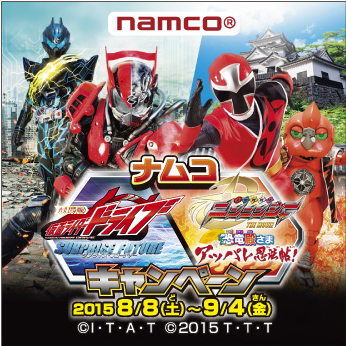 株式会社ナムコ(本社:東京都港区)は、2015年8月8日(土)より全国の映画館で公開される「劇場版 仮面ライダードライブ/手裏剣戦隊ニンニンジャー THE MOVIE」を記念し、『ナムコ × 劇場版 仮面ライダードライブ/手裏剣戦隊ニンニンジャー THE MOVIE』キャンペーンを全国約50店舗のナムコ直営アミューズメント施設にて2015年8月8日(土)から9月4日(金)の日程で開催いたします。