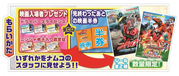 キャンペーン期間中、劇場でもらえる「映画入場者プレゼント」の“ドライバーズライセンス”“ニンジャ弟子入り認定証”または観賞済み映画半券をナムコのお店でスタッフに提示されたお客様に、オリジナルA6サイズシール(数量限定/全2種)を1枚プレゼントいたします。