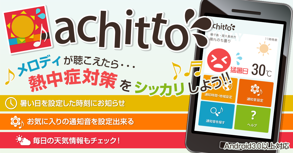株式会社モバイルファクトリー(本社:東京都品川区、代表取締役:宮嶌裕二 以下、モバイルファクトリー)は、熱中症に注意すべき暑い日を通知するアプリ「achitto(あちっと)」を2015年7月31日(金)よりGoogle Playにて配信開始しました。