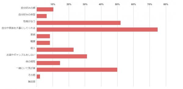 第一位は「自分や家族を大事にしてくれる」で75.0%、以下「性格が合う」52.1%、「一緒にいて気が楽」50.0%と、結婚相手には内面を第一に求めていることが分かりました。
