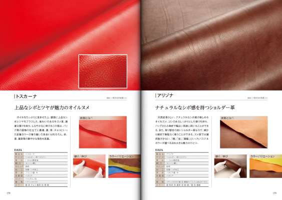 巻末には、90種類以上にも及ぶ皮革を掲載する「レザーカタログ」を掲載。