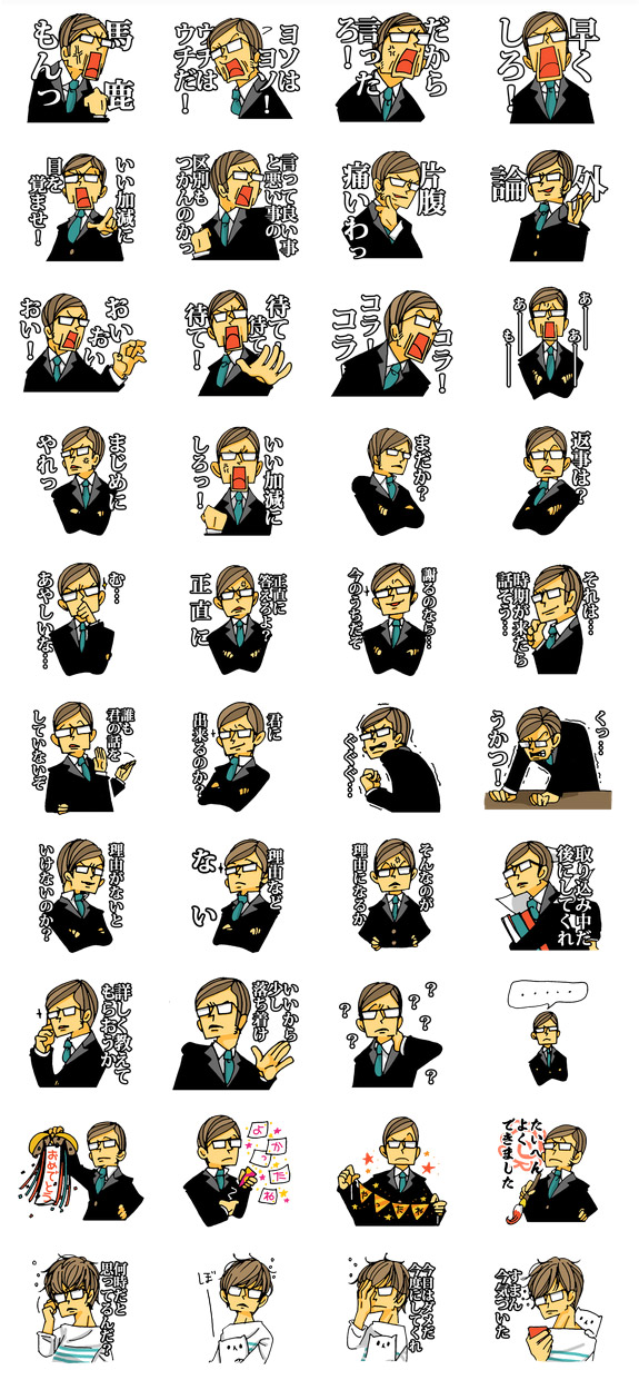 弊社オリジナルキャラクター「上から部長」の第5弾のスタンプが販売開始されました。キツめのセリフが好評のこのスタンプ、今回は「説教系」「ツッコミフレーズ系」などの定番の物から、言葉を出さずにお祝いする「お祝い系」、クールなキャラクターが少し崩れているクスっと笑える「意外系」まで、幅広く使いやすいスタンプが揃っています。