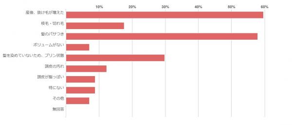 その結果、84.2%のママさんが、出産後に美容院に行く回数が減ってしまったとご回答くださいました。また、半数以上のママさんが抜け毛とパサつきについてお悩みだと分かりました。結果の詳細をご覧ください。