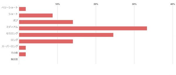 最も多かったのは「ミディアム」で33.3%。その次が「セミロング」24.6%で、結んだりまとめたりしやすい髪の長さが支持されていることが分かりました。