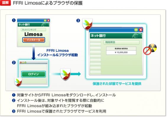 サイバーセキュリティ領域において国内で独自の研究開発活動を展開している株式会社FFRI(本社:東京都渋谷区、代表取締役社長:鵜飼裕司、以下 FFRI)は、ネットバンキングにおける新たなサイバー脅威であるMITB(Man in the browser)攻撃からネットバンキングユーザーを保護する、Web Browser Protection「FFRI Limosa Version1.3」の出荷を2015年8月7日より開始いたします。