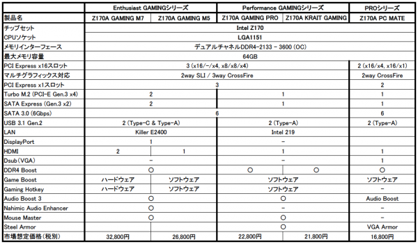 Performance GAMINGシリーズは、MMOなどのオンラインゲームを楽しむユーザー向けに機能を絞り込んだモデル。ネットワーク機能には安定性で定評があるIntel LANチップを採用。PCI Express 3.0 x4接続のTurbo M.2スロットを1基搭載するほか、「Z170A GAMING PRO」ではRGB LEDを標準装備します。また、「Z170A KRAIT GAMING」は黒と白のモノトーンで人気のシリーズ初のメインストリームモデルとなります。一方、ビジネス・一般ユーザー向けのPROシリーズの「Z170A PC MATE」では、第6世代Coreプロセッサ内蔵グラフィックスでは非サポートとなったアナログRGB出力にも対応。また、USB 3.1 Gen.2やTurbo M.2といった最新規格にも対応しています。