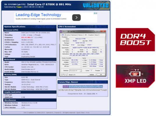2015年8月6日-Micro-Star International Co. Ltd., 台湾・新北市- Micro- Star International Co. Ltd.(MSI)は、最新Z170マザーボード「MSI Z170A XPOWER GAMING TITANIUM EDITION」が、その類い稀なるオーバークロック性能を見せつけ、デュアルチャネルDDR4メモリ環境で4605MHzのスピードを実現しました。われわれ独自の「DDR4 BOOSTテクノロジ」が、いかにIntel Z170マザーボードにおけるメモリ性能の最適化に寄与しているかがお分かりいただけると思います。この偉業により、最新のZ170A XPOWER GAMING TITANIUM EDITIONが、シングルチャネルメモリ性能の壁を打ち破るだけでなく、デュアルチャネル環境下でも驚異的な性能を引き出すことに役立つことが証明されました。