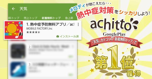 株式会社モバイルファクトリー(本社:東京都品川区、代表取締役:宮嶌裕二 以下、モバイルファクトリー)が、2015年7月31日(金)より提供を開始している熱中症予防無料アプリ「achitto(あちっと)」が、2015年8月4日(火)にGoogle Playの「お天気」カテゴリで「新着無料トップ」で1位を獲得しました。