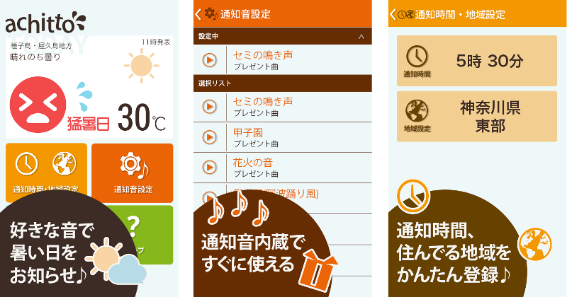 「achitto」(あちっと)とは、熱中症になりやすい25度以上の夏日や真夏日、猛暑日を好きな楽曲で設定した時間にお知らせしてくれる熱中症予防アプリです。g15現在提供している「着信音設定アプリ/PaPatto♪♪(ぱぱっと)」及び「雨通知アプリ/ametto(あめっと)」等のインストール数50万を突破した無料の人気便利アプリシリーズの最新作です。