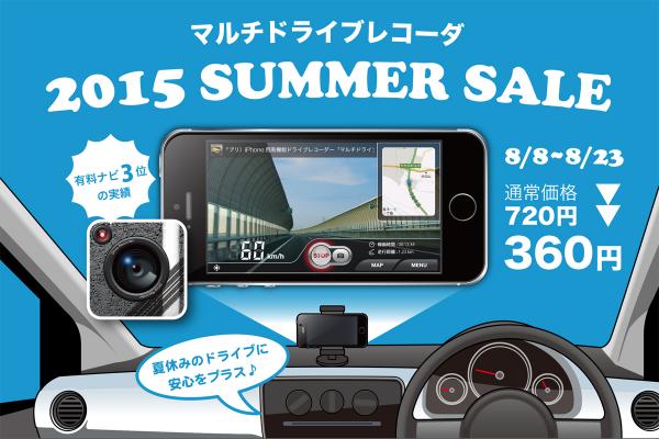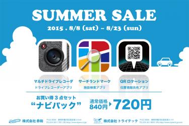 株式会社トライテックは株式会社 恭和と共同開発したiPhone用高機能ドライブレコーダー「マルチドライブレコーダ」および「マルチドライブレコーダ」を含むナビアプリ3点セット「ナビパック」のサマーセールを2015年8月8日(土)から2015年8月23日(日)に開催致しします。期間中は「マルチドライブレコーダ」単品の通常価格720円を特別価格360円で、「ナビパック」の通常価格840円を特別価格720円で、それぞれ提供させて頂きます。