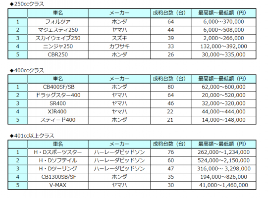 情報流通支援サービスの株式会社オークネット(本社:東京都港区/社長:藤崎清孝)は、2015年7月度のオークネットバイクオークションにおける成約台数を集計し、排気量別ランキングベスト5をまとめました。
